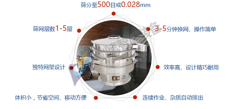 特點:任何顆粒、粉末、粘液一定范圍內均可篩選。篩分細至500目或0.028mm, 過濾小可至5微米。分級篩選,可篩一至五層篩網,能同時進行二至六個等級的分選或過濾。效率高、設計精巧耐用,換網容易、操作簡單、清洗方便。三元旋振篩雜質、粗料自動排出,可以連續作業。獨特網架設計,篩網使用時間長久,換網快,只需3—5分鐘。體積小,節省空間,移動方便。